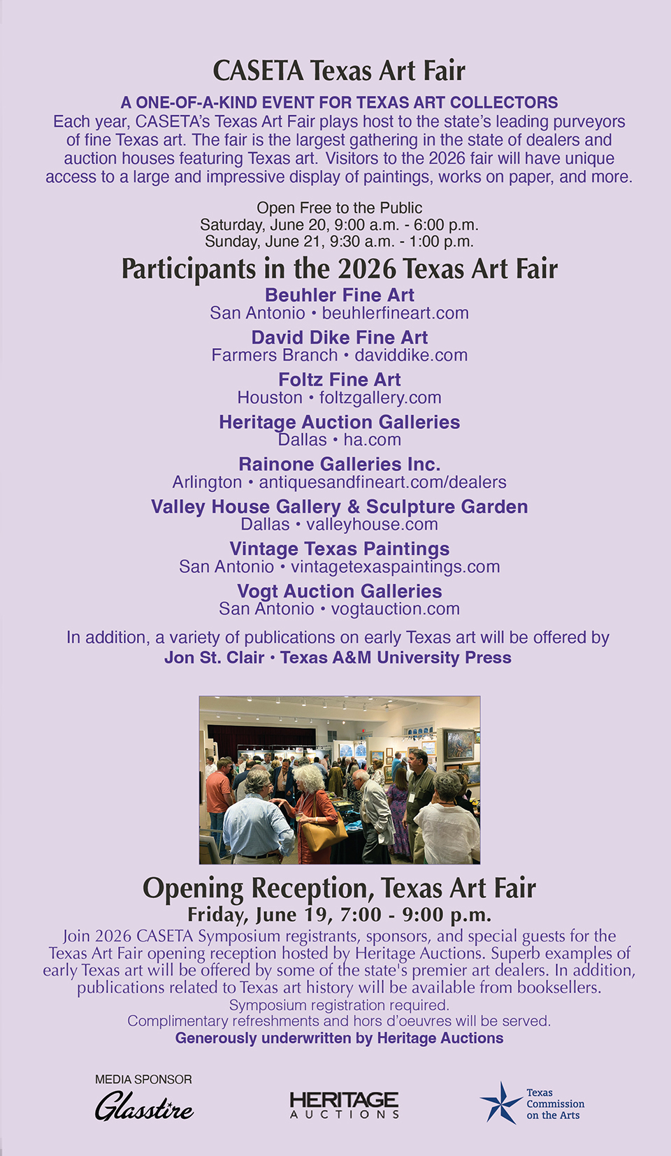 CASETA’s annual Symposium and Texas Art Fair is our signature event for anyone who is interested in early Texas art. The event location each year rotates between several Texas cities. Over 3 days, leading collectors, scholars, art dealers, museum professionals, educators and early Texas art enthusiasts meet to share new research, information and discoveries in the field during the Symposium. The Texas Art Fair provides opportunities for both attendees and the public to view and select from a wide range of early Texas art.